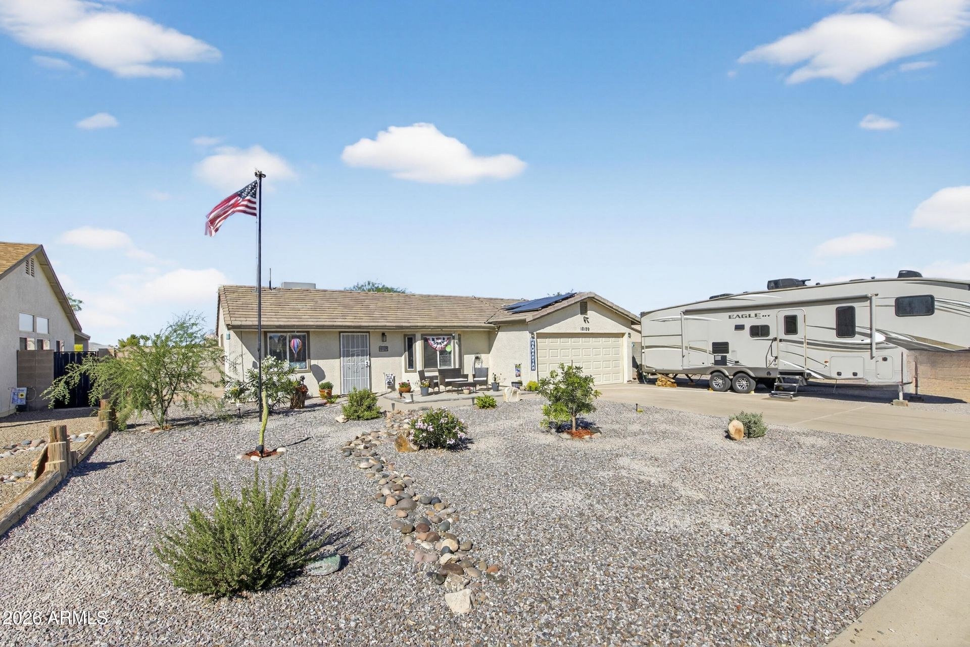 Move-in ready 3-bedroom, 2-bath home in Arizona City featuring a split floor plan, vaulted ceilings, and laminate and tile flooring throughout. Kitchen is nicely updated with white cabinets, quartz countertops, newer stainless steel appliances, and a walk-in pantry. Updated lighting, fans, and fixtures add to the homes fresh feel. Enjoy a large backyard with covered patio, storage shed, and space to make it your own. Dual pane windows, 2-car garage, 2024 roof, 2024 water heater, and VA assumable financing make this one stand out.