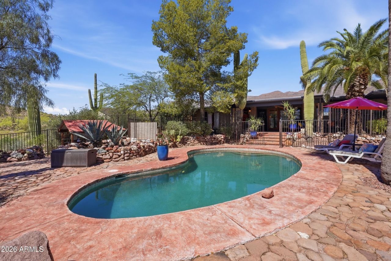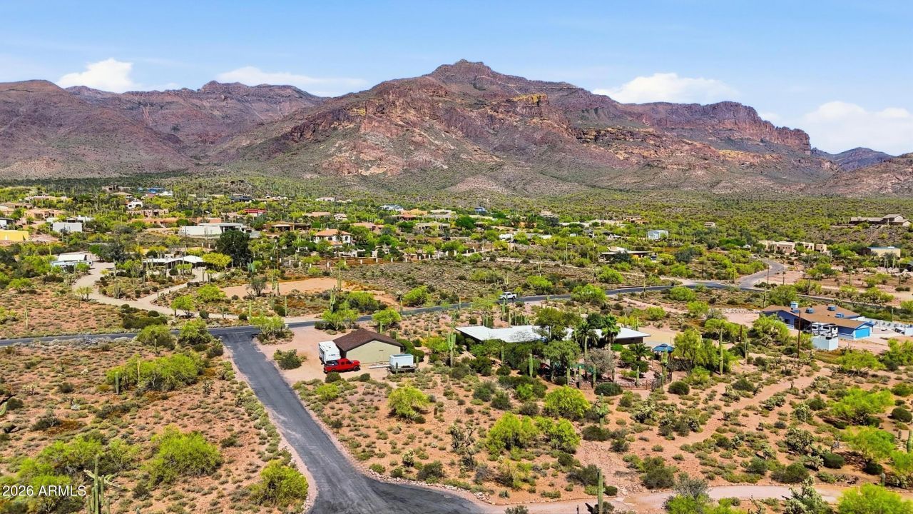 OVER 1.5 ACRES! Desert living with breathtaking Superstition Mountain views on 1.56 acres in the majestic Kings Ranch area of Gold Canyon. This 3-bedroom home plus bonus room offers space, flexibility, and privacy. Influence of Lloyd Wright design is evident, adding unique architectural character with a built-in electric fireplace. Outdoors resembles a meticulous, tranquil garden with luxurious palms, carefully placed shade trees, assorted cactus, and stone and paver pathways. Enjoy a private in-ground pool with stunning views. Expansive corner lot ideal for HORSES or future casita. Oversized 4-car garage detached garage with additional rooms offers endless possibilities. Welcome to your new dream home A great place to entertain friend and family. No HOA. A must see!