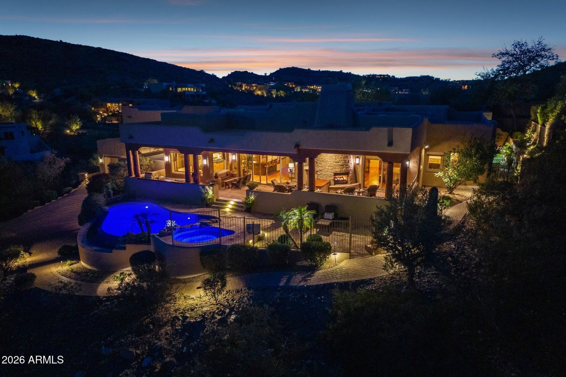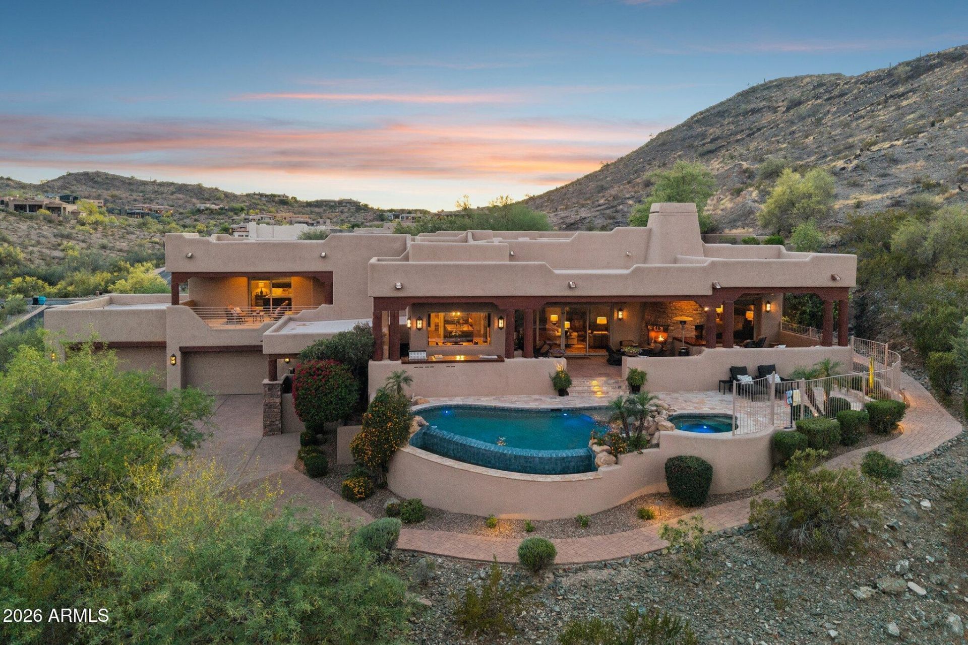 Gorgeous luxury estate in the mountains of Tapestry Canyon. Boasts panoramic views of desert preserve, Four Peaks, Red Mountain, and city lights. Exceptional great room layout with privacy and seclusion. Five different covered patios offer ample places to relax, sit by one of four fireplaces, and enjoy this lavish retreat. Open, gourmet kitchen has it all with elegant concrete countertops, oversized pantry, Butlers pantry, Subzero, Dacor, Wolf and Bosch appliances. Primary living quarters offers dual showers, large steam shower with mood lighting and infrared ceiling lamp at exit. Travertine custom floors. Electric Privacy blinds t/o. Updated surround speakers t/o. Extended four car garage with copious storage space. This is a gem with a one-of-a-kind lot that must be seen to be believed.