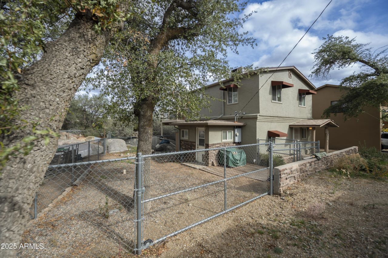 Completely remodeled 2-bedroom, 1 ¾-bath home nestled among the stunning boulders of Yarnell. This unique two-story home combines modern updates with distinctive charm, featuring new tile floors, kitchen cabinets, appliances, and bathroom fixtures. Elegant design touches include an Art Deco tub, stained glass window, copper accents, and unique lighting throughout. The main levevl (downstairs) has a pellet stove for auxillary heating. Upstairs, French doors open from the cozy sitting room to a spacious deck, perfect for relaxing or entertaining while taking in the tranquil surroundings. Recent improvements include a new roof (2024), new electrical panel, updated plumbing and wiring, and a property water shut-off valve. The flexible floor plan and inviting outdoor space with trees and boulders make this home a perfect retreat. Easy to show and move-in ready.
