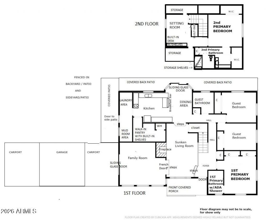 A beautiful 2-story home in a nice location close to everything in town. It sits back off road but still has plenty of space on this .78-acre property for an RV with its own septic & full hook-up or build a guest house. The house boasts several covered patios to enjoy the fenced backyard or sit out front & take in the views of Mt Graham. Enter into the foyer & sunken living room with wood burning fireplace & French Doors that lead into the family room with sliding glass door to one of the carports. Large kitchen with plenty of storage, breakfast bar & dining area with a sliding glass door to the yard, a big walk-in pantry & a large mud/laundry room. There are two primary suites, 1 upstairs with sitting room & 1 downstairs with ADA bathroom. 2 guest bedrooms & guest bathroom downstairs too.