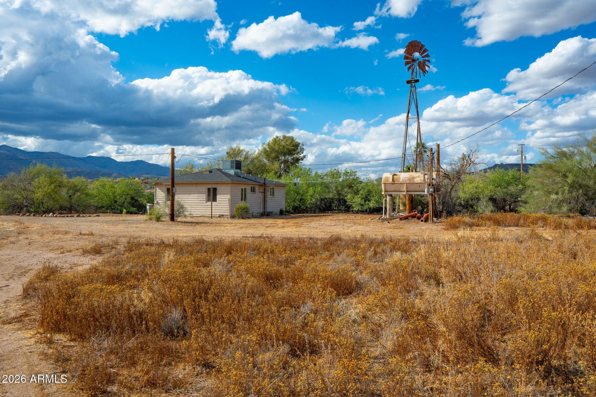 A sweet slice of Arizona living -- this 2 bedroom, 1 bath home sits on 1.5 acres of flat, fertile land with postcard worthy Bradshaw Mountain views. The home itself is compact and charming at roughly 900 sq ft, featuring wood floors, efficient HVAC, and a simple, welcoming feel.Gardeners and dreamers will love the land: open, sun soaked, and ready for raised beds, orchards, or a full garden layout. Whether youre looking for a peaceful retreat or a property with room to grow, this one checks all the boxes.