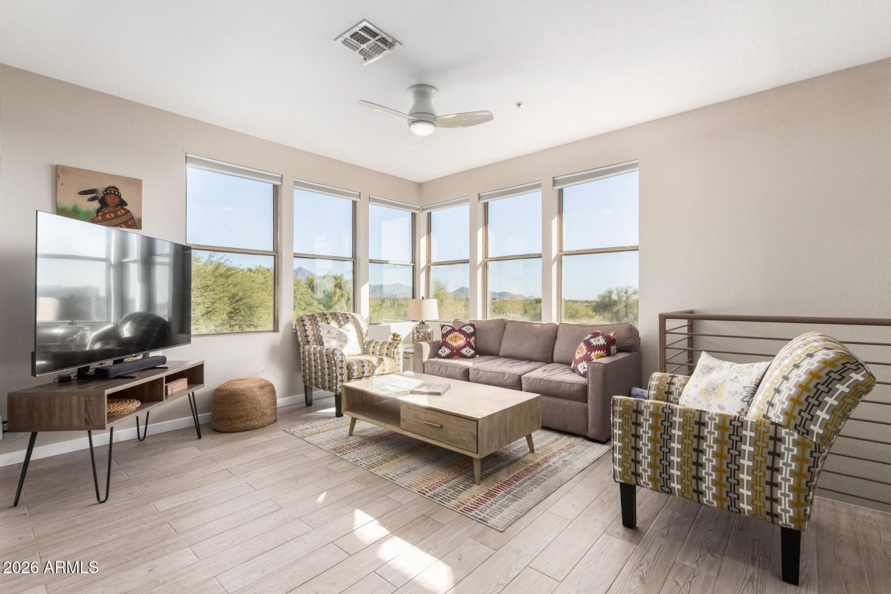 This stunning 2-bedroom, 2-bath townhome has been beautifully and thoughtfully redesigned with upscale, one-of-a-kind finishes throughout. The show-stopping chefs kitchen features sleek quartz countertops, a dramatic waterfall island, and Bosch stainless steel appliances, all perfectly positioned to capture breathtaking views.Every detail of this home has been curated for style and comfort, from the gorgeous flooring to the spa-inspired upgraded bathrooms and spacious walk-in closets in both bedrooms. Enjoy unobstructed desert and mountain views from each bedroom and relax on the spectacular private balcony overlooking serene natural surroundings.Additional highlights include a private 1-car garage with storage and laundry, convenient laundry on the top floor as well, and a premium, secluded location within the community. The seamless design, custom finishes, and incredible views make this home truly unforgettable. This Resort Style, North Scottsdale, Gated Community boasts 4 Pools, 3 Hot Tubs, 2 Movie Theaters, Game Rooms, Resident Chef, Concierge, Business Center, Conference Room, State of the Art 3000 square foot Gym, FREE Work Out Classes and so much more!!