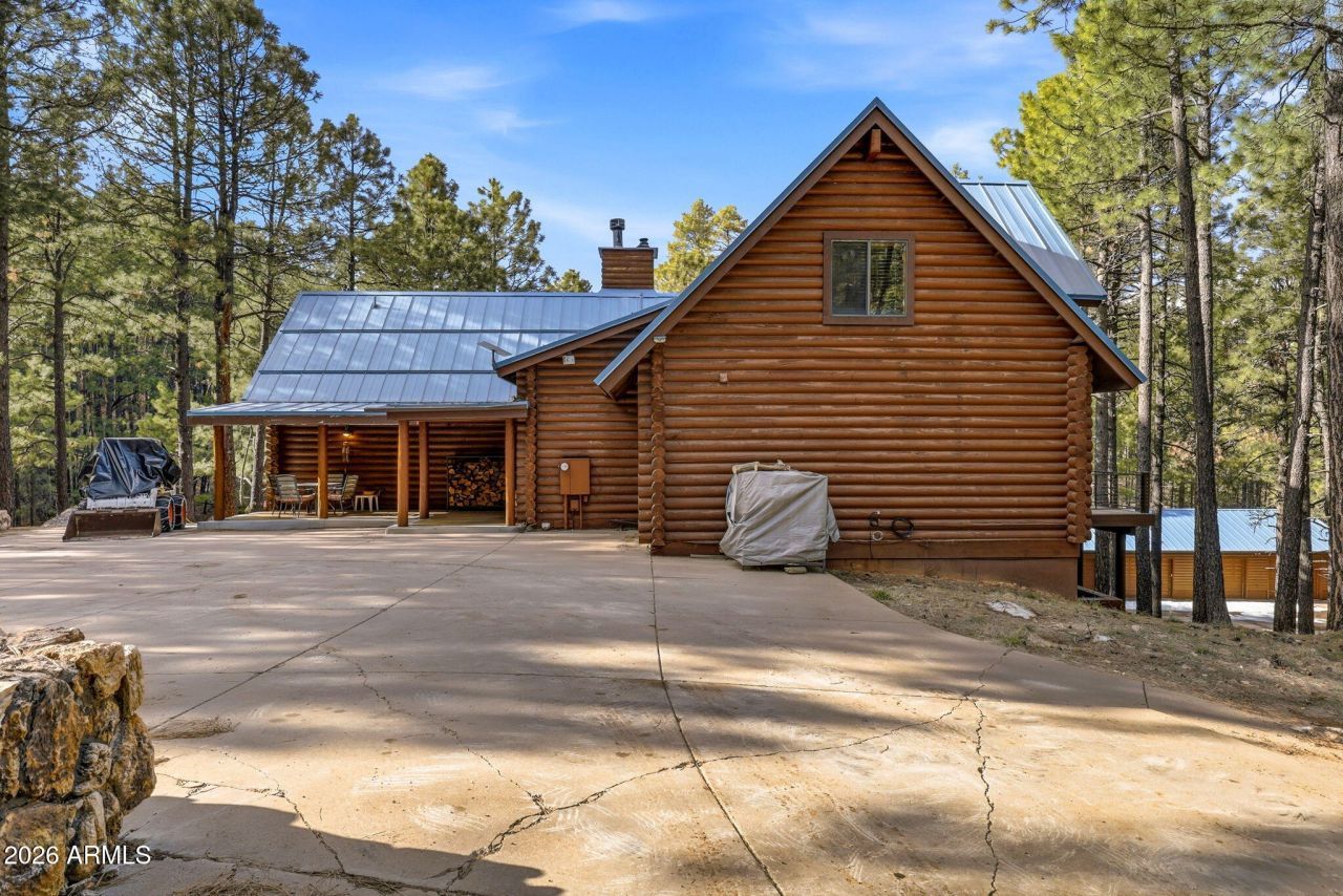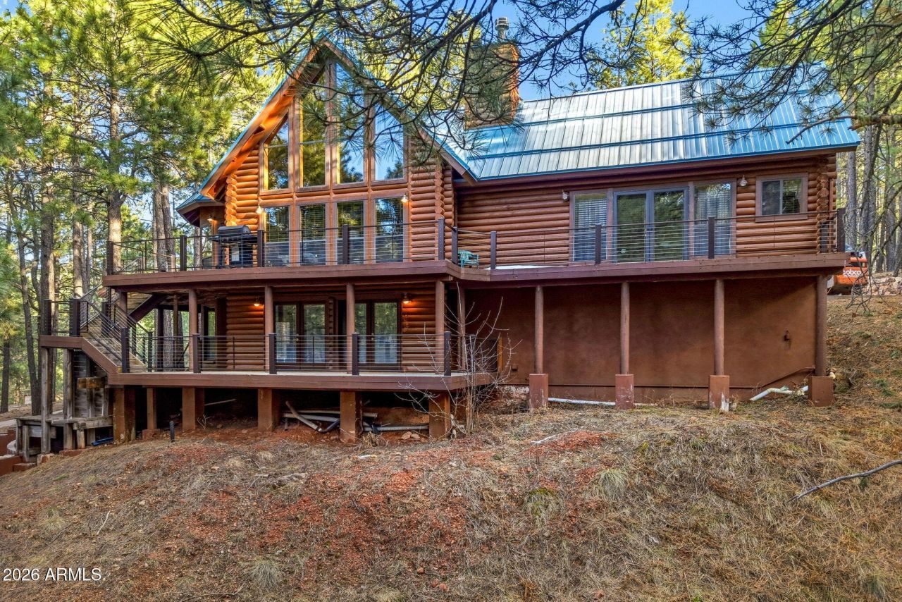 Prime Full-Log Home in Forest Lakes Estates - Borders National Forest!Discover your mountain escape in the heart of Arizonas cool pines! This full-log home sits on a peaceful cul-de-sac acre lot, directly backing to the Apache-Sitgreaves National Forest.Step inside to a warm, inviting great room with soaring vaulted ceilings, a cozy wood-burning stove, and a dramatic wall of windows framing breathtaking views of the ponderosa pines. The open main level flows seamlessly into a well-appointed kitchen, spacious master bedroom with en-suite bathroom, a convenient guest bedroom, and additional full bath.Ascend to the charming loft, ideal for extra sleeping quarters, a cozy reading nook, or home office, complete with its own private balcony.The fully finished basement offers even more.. living space: a welcoming family room with a second wood-burning fireplace, a fun game room, dedicated laundry, another guest bedroom, and bathroom.Step outside to expansive balconies off both the main level and basement, with stairs leading down to the backyard and the impressive detached 4-car garage (built in 2004 complete with attached workshop and ample attic storage, all finished in matching log siding). Recent updates include a new roof on both the home and garage (2022) and updated balcony railings.Offered fully furnished--move in and start enjoying the Rim Country lifestyle immediately!Dont miss this rare opportunity to own a true piece of Arizonas high-country paradise!