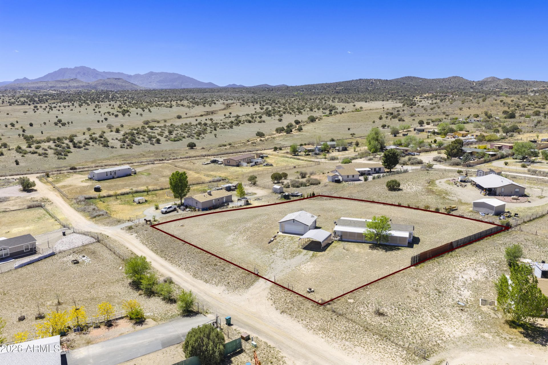 Come to see this 2 bed 2 bath with 2 car garage and carport on 1 + acre. Stay for the views. This Big sky property has amazing views of Granite Mountain, Mingus and the Bradshaw Mountains. The front and back Porches are screened and covered providing additional enjoyable relaxing areas for morning coffee and evening desert. The two bedrooms are good sized and primary has a walk in closet. 3 storage sheds out back with an owned propane tank. ADA ramp from garage, carport area to front porch if needed. The property is fully fenced with solar powered driveway gate. The Owners have taken the few cosmetic repairs needed into consideration of the Listing Price.