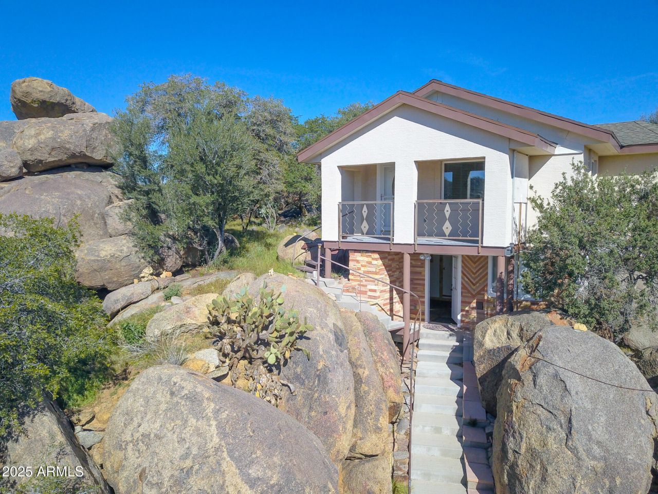 This home is located within the town of Yarnell in the lovely subdivision of Glen Lilah, the custom-built home is set perfectly into the elevated boulders. The main floor is level living with a front patio to take in the views. The lower level consists of 3 storage rooms one for storage and the other two are workshops. In addition to the home there is a large storage shed to back of the house. The property consists of TWO PARCELS. One for the home and storage shed. The other lot has a large two car garage with easy access from the street. The land is rich with large boulder outcroppings and private alcoves. The front of the property has a nice level area for farm animals if desired. This unique property was built by a gentleman who took great pride in his craftsmanship. This unique property was built by a gentleman who took great pride in his craftsmanship. From the steel framing to the abundance of wood design throughout makes this a must-see property.