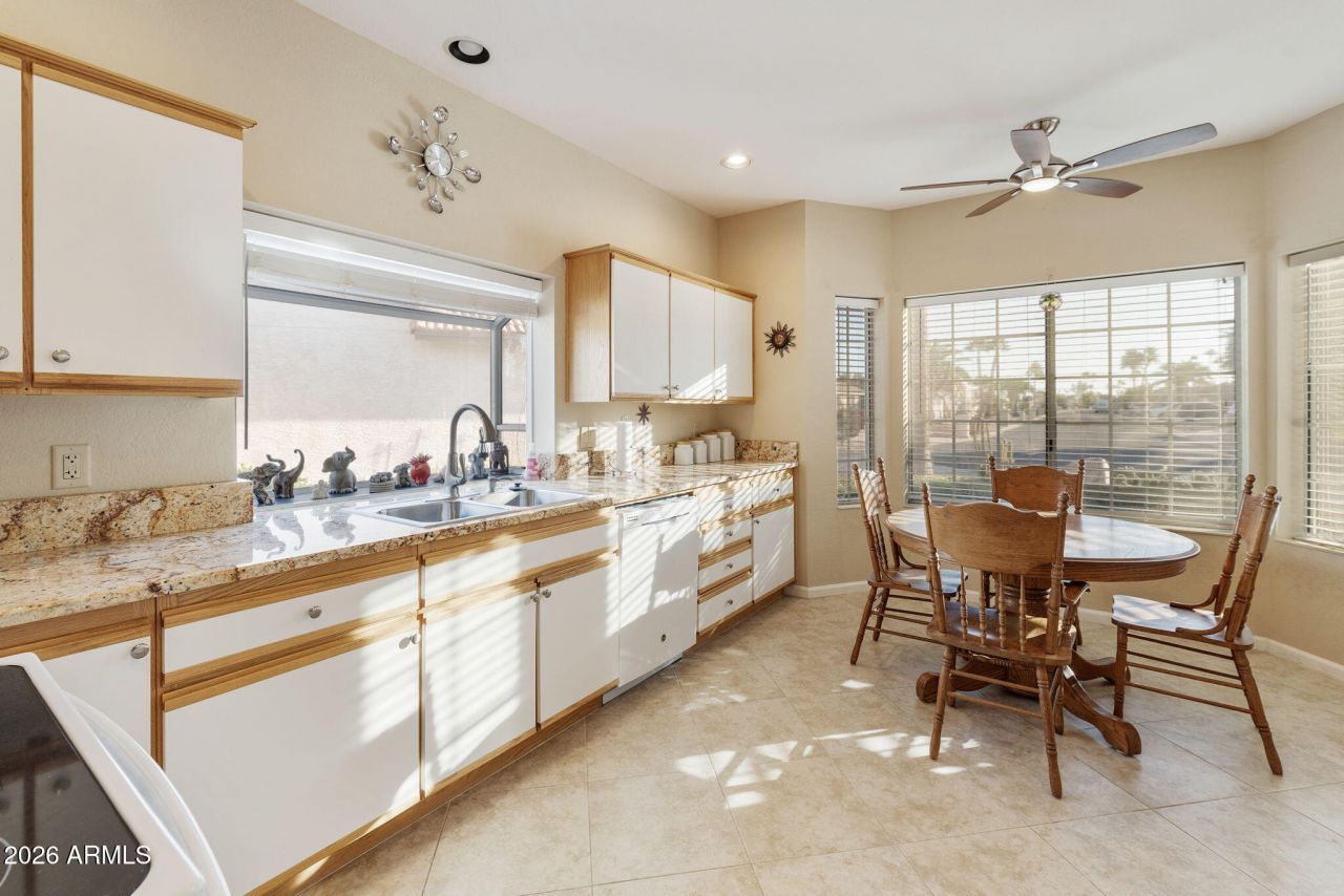 Pristine 2BR, 2BA expanded Cortez model in the active adult community of Cottonwood at Sun Lakes. New carpet throughout and modern 20 tile in the kitchen and baths. Great room with tons of windows and vaulted ceiling for a bright spacious feel. Kitchen features a sunny little breakfast nook, granite counters and newer appliances. Large primary suite with vaulted ceiling, dual sinks, toilet room and walk-in closet. The guest room has an addition with multiple windows, perfect for a small office or sitting room. Wrap-around covered patio is completely screened in with modern aluminum framed screen inserts. Oversized backyard with mature fruit trees and a storage shed. Exterior recently painted and a 2014 Trane AC. Start enjoying the many amenities of Cottonwood SEE MORE with golf, tennis, pools, pickleball, restaurants and clubs.