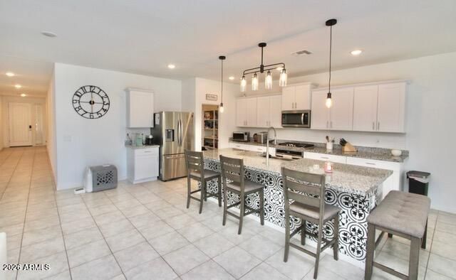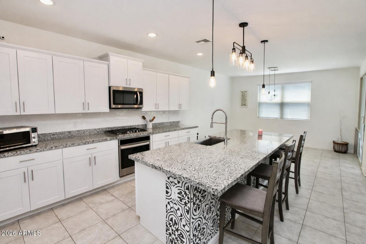 Spacious and modern energy-efficient single-story home built in 2021 featuring 5 bedrooms 3 full bathrooms, and 3 garage spaces, perfect for growing families. With 2,528 sqft of living space, this single-level home offers an open and functional layout designed for comfort and convenience, along with high flat ceilings that enhance the spacious feel. Enjoy a bright interior and an open kitchen where the sprawling island overlooks the great room, dining area, and adjacent covered patio. The spacious primary suite features a large walk-in shower, free-standing tub and dual sinks. Each of the bedrooms includes walk-in closets. Step outside to a spacious, low-care backyard. Located at Mission Royale Estate Series, a family-friendly community.