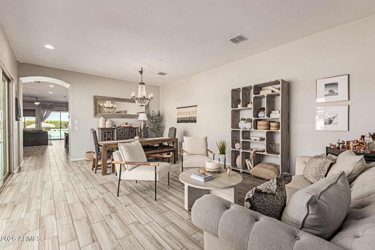 Modern luxury meets resort-style living in this stunning Gilbert home! Amazing single level plan features 4 beds+ den & 3.5 baths! Neutral tile floors & new carpet in bedrooms. The kitchen features an oversized island, gorgeous granite, gas cooktop, Insta-hot water, new dishwasher, custom cabinetry, coffee bar & beverage fridge. Youll love the family room with electric FP, surround sound speakers & views of the pool. The primary suite offers a fully updated spa-like bath w/ new counters, tiled shower w/ 3 shower heads & updated fixtures. Marble counters in guest baths. Enjoy a backyard oasis with a pool & spa (added in 2022), travertine decking & built-in gas BBQ--perfect for Arizona entertaining. Dont miss the putting green, patio misters, tankless water heater & overhead garage racks. Walking distance from Verde at Cooley Station, offering many restaurants and shops. HOA features community pool, kids playground and spacious greenbelt. Home backs up to Desert Sky Park which currently offers a lake, ninja warrior course & 4 multi-purpose fields. It is set to add another field, a splash pad, two playgrounds, 8 pickleball courts and more!