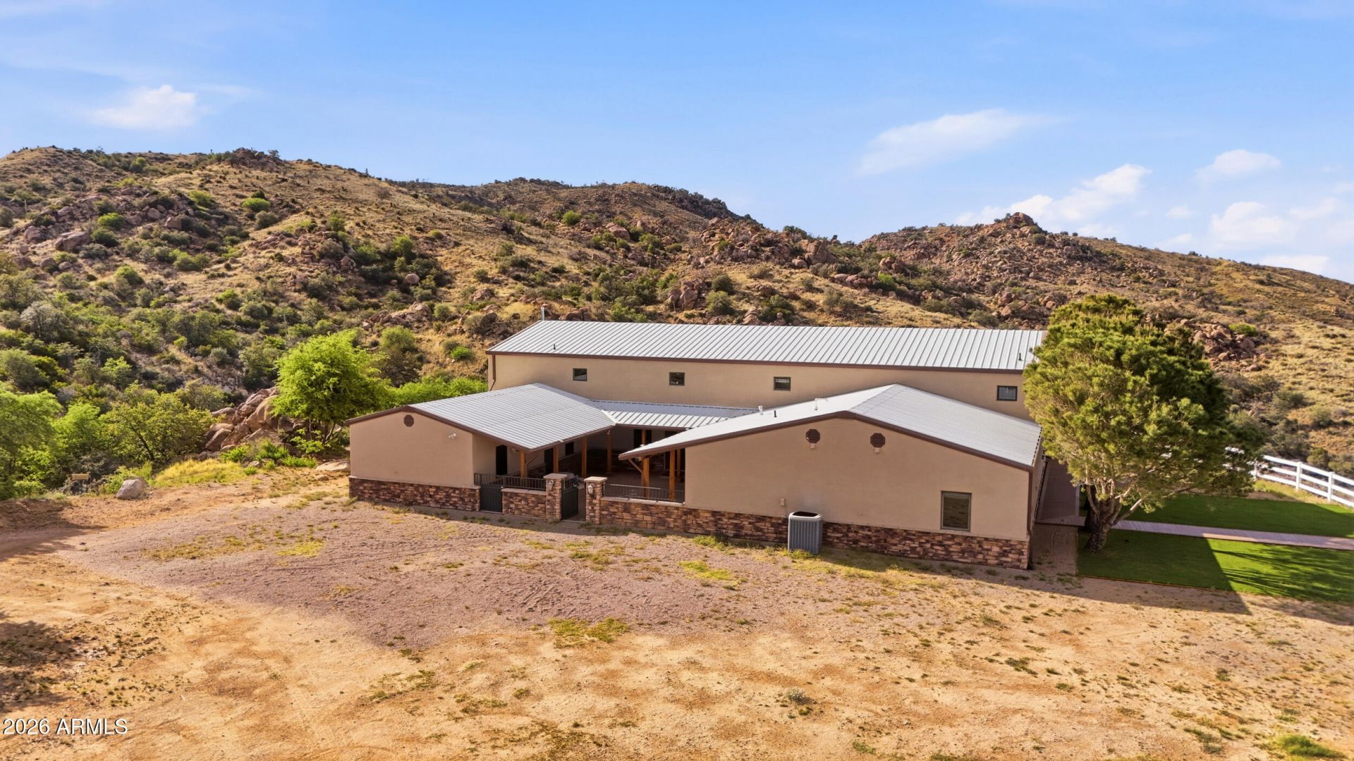Hilltop Luxury with Panoramic Views & Endless Possibilities. Custom-built estate on 7 private acres surrounded by Coronado National Forest with mature trees & direct Arizona Trail access. Primarily single-level living with loft above. Light-filled interior with vaulted wood ceilings, spacious kitchen with breakfast bar & dining area, plus entertainers lounge with built-in bar, drop-down movie screen, & pool table area. Arizona Room with built-in BBQ opens to patios & scenic platforms perfect for gatherings. Main home offers 3 bonus rooms, highlighted by a metal roof & natural rock. No HOA-bring your toys and RVs with full hookups. Includes a permitted 5,000 sq ft climate-controlled garage/barn with two RV doors, half bath, office, laundry, & a bonus suite with adjacent kitchen & bathroom. Plus permitted 720 sq ft horse facility with stalls, turnouts, & tack room. An ideal season retreat with space for RVs, equipment, or equestrian us - perfect for those seeing a mild winter escape and year-round outdoor living. Imagine the memories youll make here!