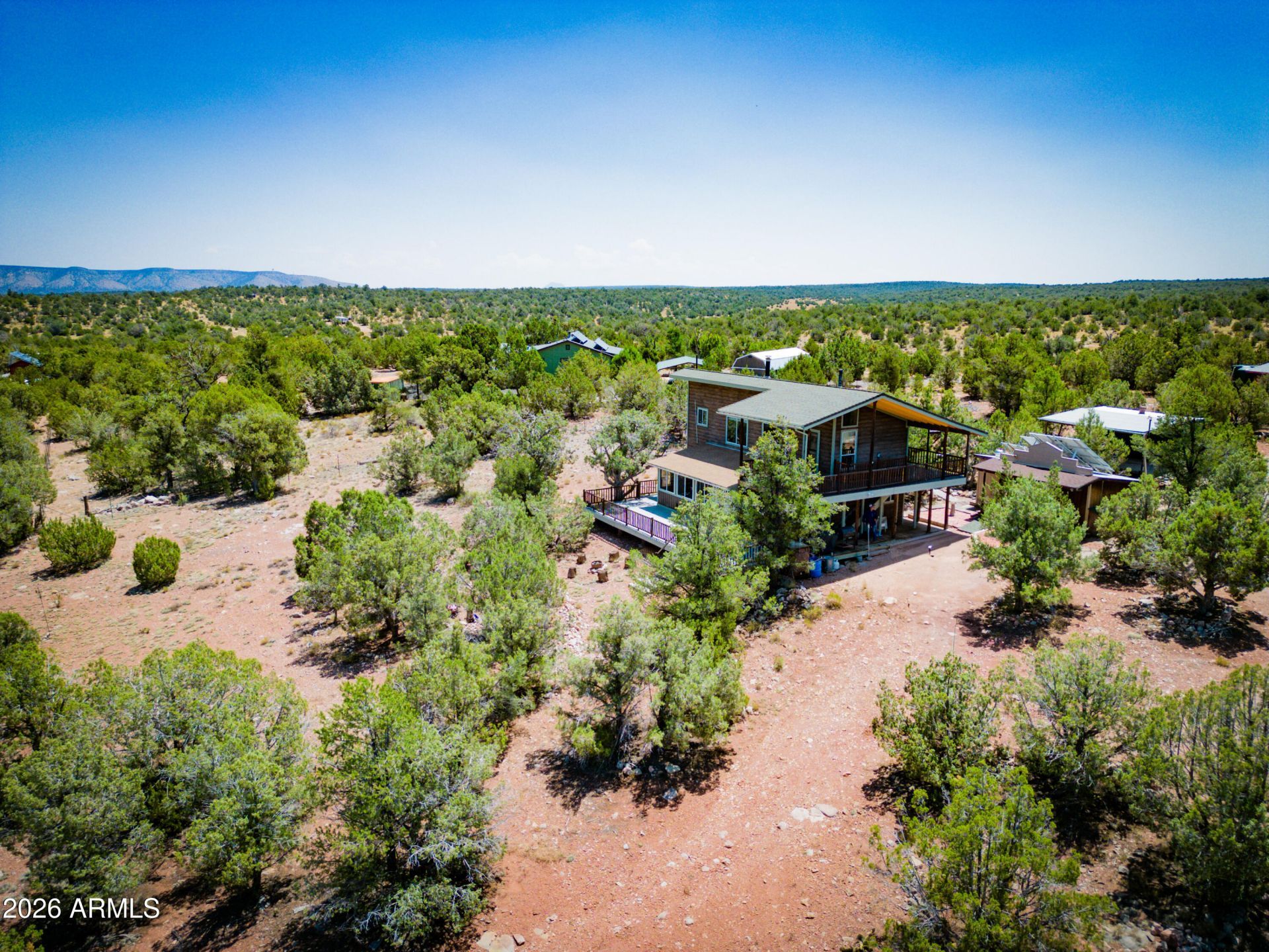 Breathtaking Views! Mountain cabin on 4 private acres in Northern Arizona, offering space for everyone. Thoughtfully designed to capture the views, with expansive decks and an upper-level bar/game room perfect for entertaining. The kitchen is a standout, featuring a vintage Wedgewood stove. Warm wood accents and unique touches like tin ceilings add character throughout. Fully off-grid with a newer Sol-Ark 5K solar system, lithium battery storage, additional 12V system, and generator backup. Water storage plus multiple rainwater collection systems; water station just 2 miles away with delivery available. Additional features include a powered workshop and a 20-ft cargo container with carport--ideal for storage or toys. Sold fully furnished, right down to the silverware.