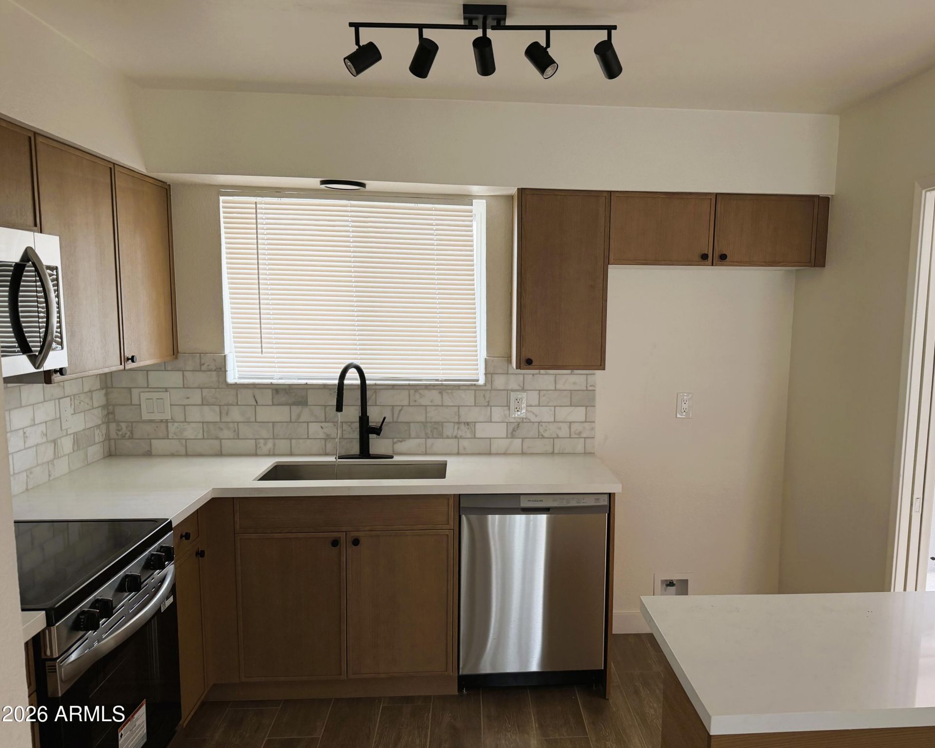 Desert charm meets modern style in this single-story Phoenix home with NEW AC & NO HOA! This 2 bed, 1 bath home features fresh interior paint, wood-look tile in main areas, and new carpet in the bedrooms. The updated kitchen offers oak shaker cabinets, white quartz countertops, stainless steel appliances, and breakfast bar seating, opening to a spacious great room--perfect for entertaining. The backyard is a blank canvas ready for your personal touch. Ideally located near the Loop 101 and Banner Estrella. A great opportunity for a first-time buyer or investment property!