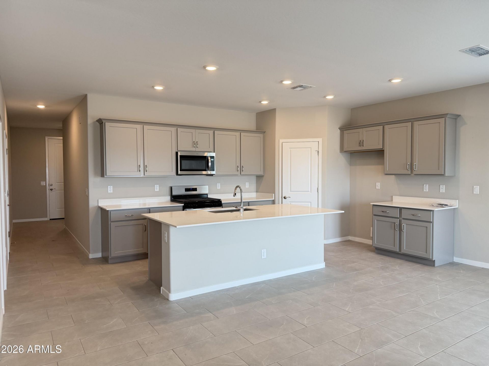 GORGEOUS well appointed 3 bed 2 bath home! Spacious island kitchen overlooks family room and dining room ideal for entertaining family and friends. The perfect blend of beauty meets functionality with luxurious quartz in kitchen and baths, crisp white cabinetry with soft close cabinets & drawers, neutral 12X24 tile throughout, carpet in bedrooms. 2 TONE PAINT! Pre plumbed for laundry rm sink! GAS COOKING, single bowl kitchen sink- Tankless gas water heater, Garage door opener and convenient service door to exterior! Photos used are of a model home. Interior colors will be different for each quick move-in home.
