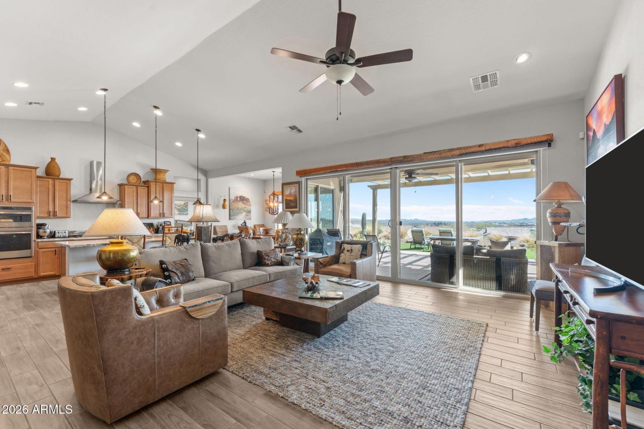 Set within the desirable Outlaw neighborhood of Wickenburg Ranch, this Wild Horses model captures the essence of relaxed desert living with a refined, modern edge. From the moment you arrive, the homes inviting presence and thoughtful design set the tone for whats inside. Step into an open-concept floor plan where natural light pours in through expansive windows and large sliding glass doors, creating a seamless connection between indoor and outdoor living. The great room flows effortlessly into a well-appointed kitchen, offering generous counter space, quality finishes, and a layout ideal for both everyday living and entertaining. The primary suite provides a quiet retreat, complete with a spacious layout and a well-designed en-suite bath. Additional bedrooms, separated by a barn door, offer flexibility for guests, hobbies, or an additional home office. Out back is where this home truly shines. The extended patio and pergola frame sweeping views that capture Arizonas breathtaking sunrises, while the stone gas fireplace creates a warm, inviting space to gather year-round. Whether youre enjoying a quiet morning or hosting friends in the evening, this outdoor setting delivers an exceptional lifestyle experience. Blending comfort, style, and functionality, this Wild Horses model offers a rare opportunity to enjoy elevated living in one of Wickenburg Ranchs most sought-after neighborhoods.