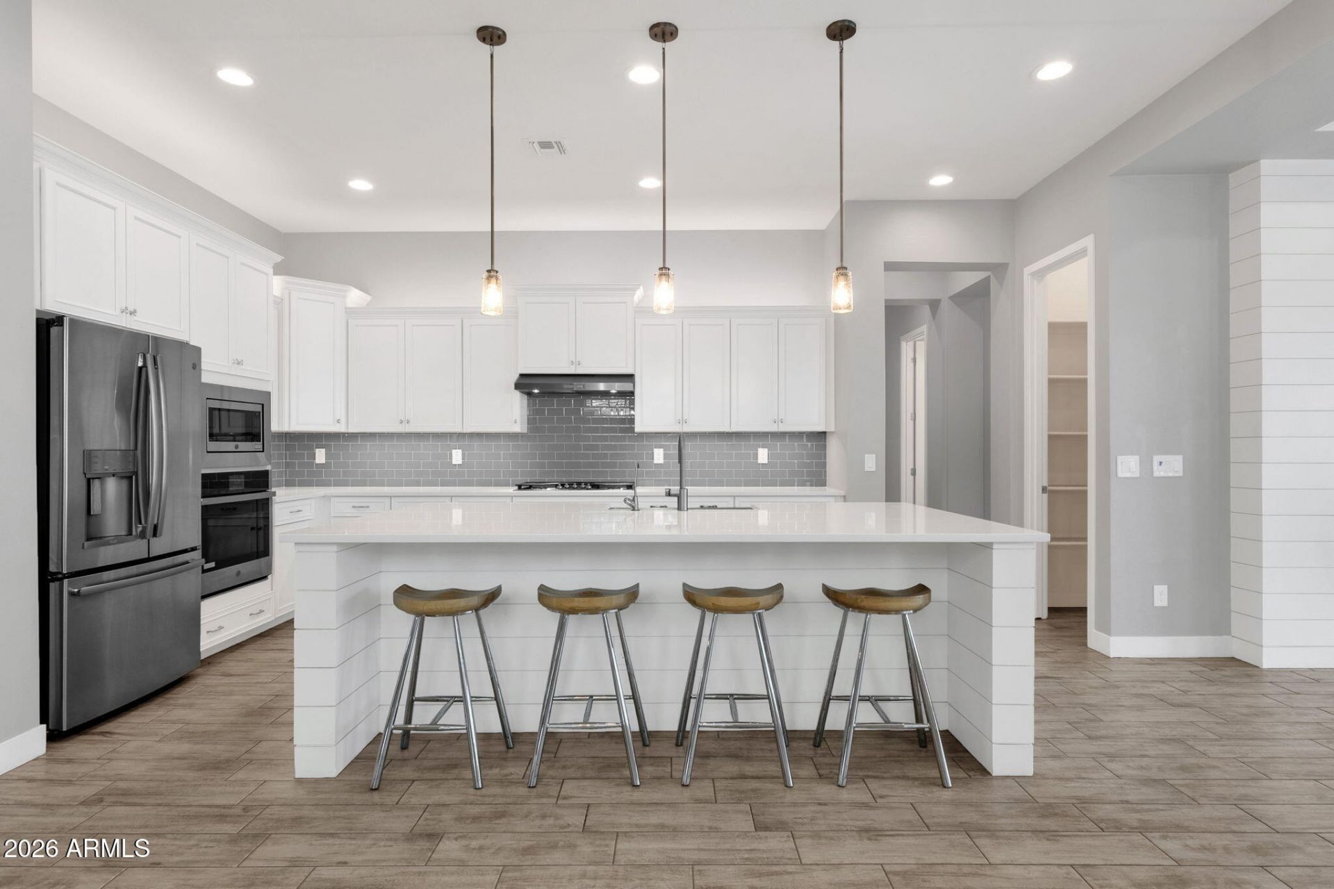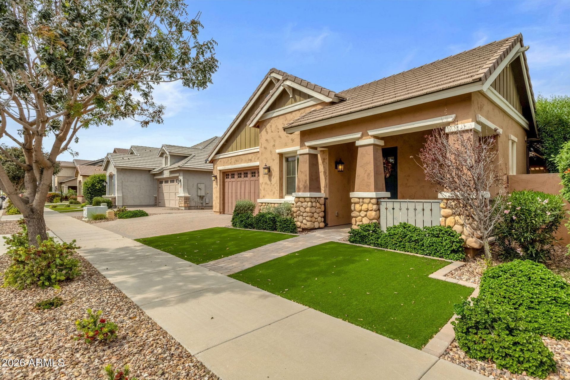 Beautifully upgraded 4 bedroom 3.5 bathroom home backing to a spacious greenbelt with a view fence and no rear neighbors. Open floor plan with designer finishes, quartz countertops, stainless steel appliances, and white cabinets. Tile throughout. Optional front office/den. Spacious primary suite with a large soaking tub and a separate tiled shower with a custom designed walk in closet. Enjoy outdoor living with scenic views and you are only steps to the community pool, play structure and ramada. This home is an entertainers dream, perfectly located, and move in ready!
