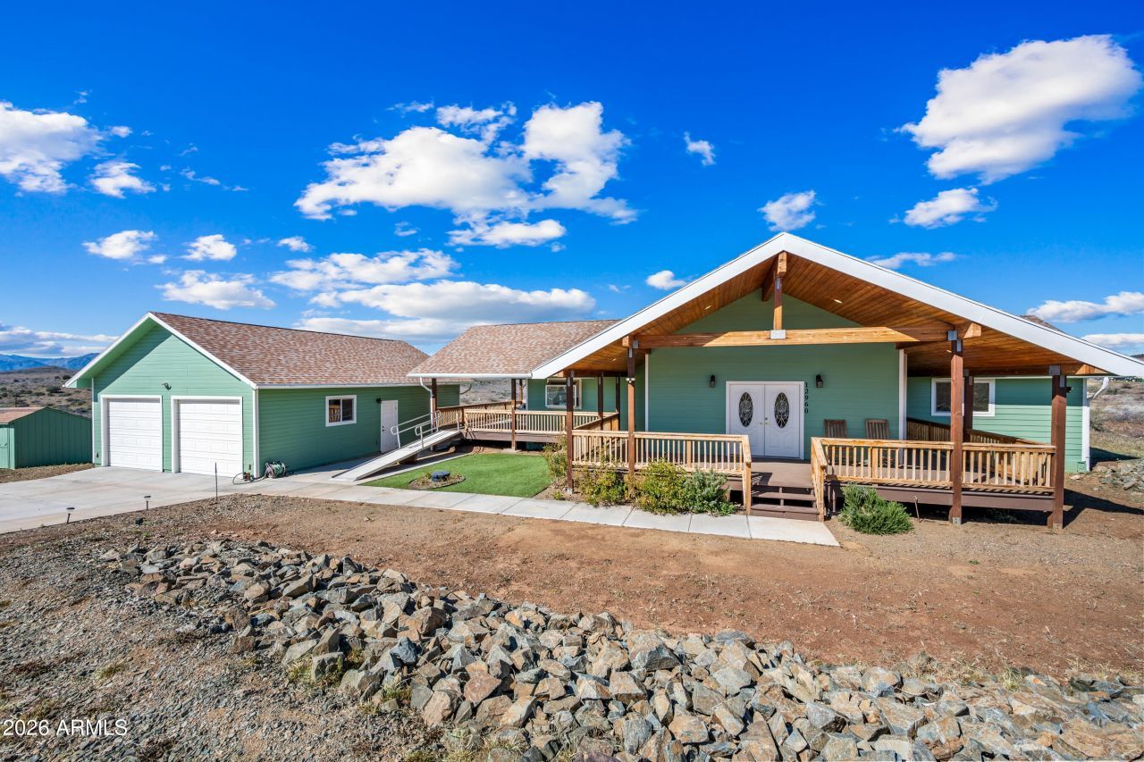 If youre looking for star filled night skies, cooler summer temps, mountain views in all directions and space, look no further! This beautiful 3 bedroom, 2 full bath home features a large great room and open concept kitchen. The great room features a massive vaulted ceiling with wood, tongue and groove planks, a cozy gas fireplace, in floor electric outlets and dining space. A large eat-in kitchen island, gas stovetop and convection oven create a wonderful experience for the home chef. The large primary suite offers a large bedroom, large walk in closet and a large primary bathroom. In the primary bathroom, you will find a separate shower with built in bench, a large jetted soaking tub and dual sink vanity. The property consists of a large 940 sq ft garage, a garden shed and... partial wrap around deck made of low maintenance composite decking. There is parking and a clean out for an RV next to the home. All this and close to BLM land, hiking trails, Prescott, the Verde Valley, Sedona and only an hour from Phoenix or Flagstaff! Seller is a licensed Real Estate Agent in the state of Arizona.